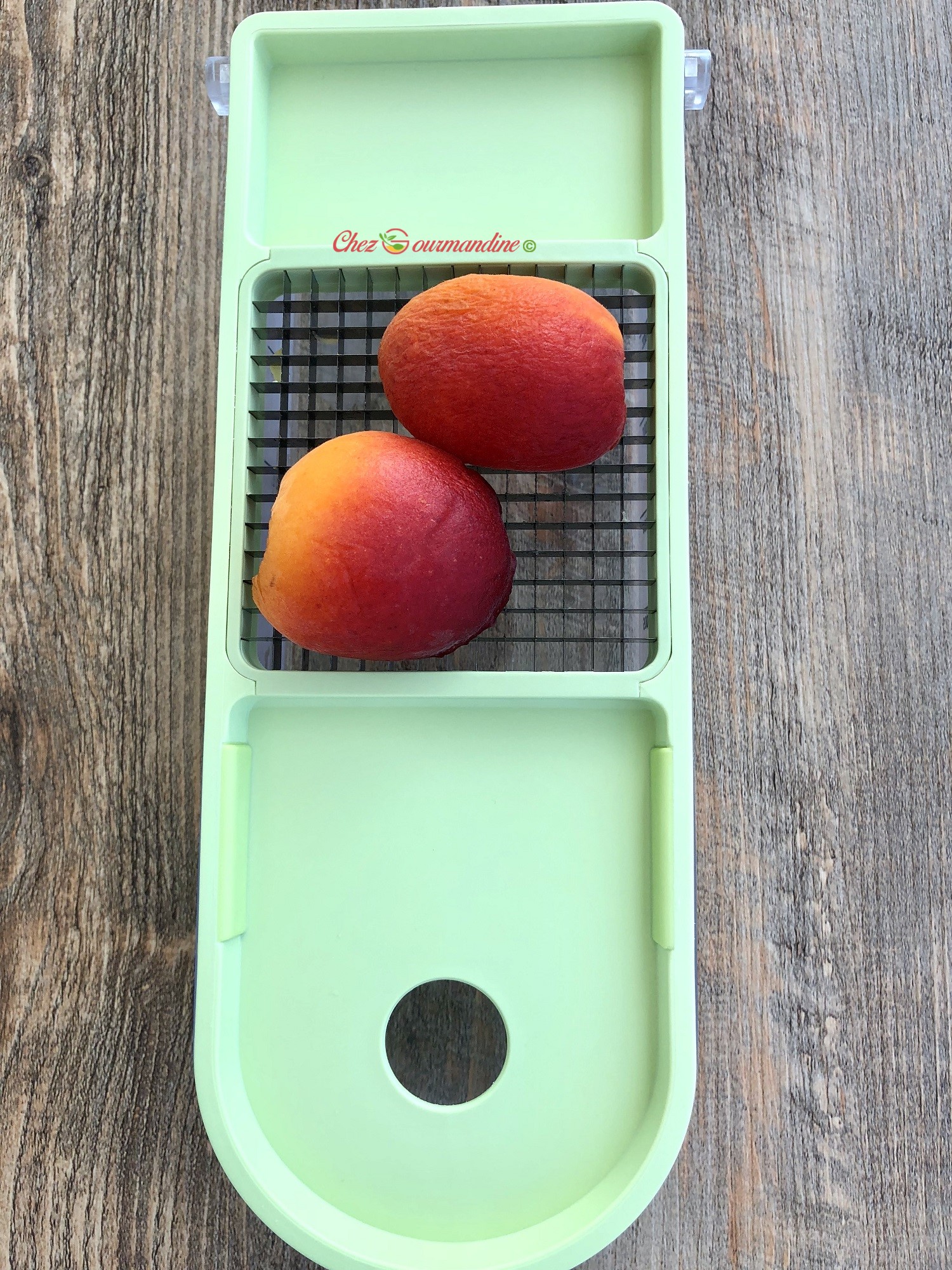 - Laver les abricots, et en découper un en petits cubes pour mettre dans le bowlcake. J’utilise mon appareil qui découpe en cubes. Vous pouvez aussi le faire au couteau.