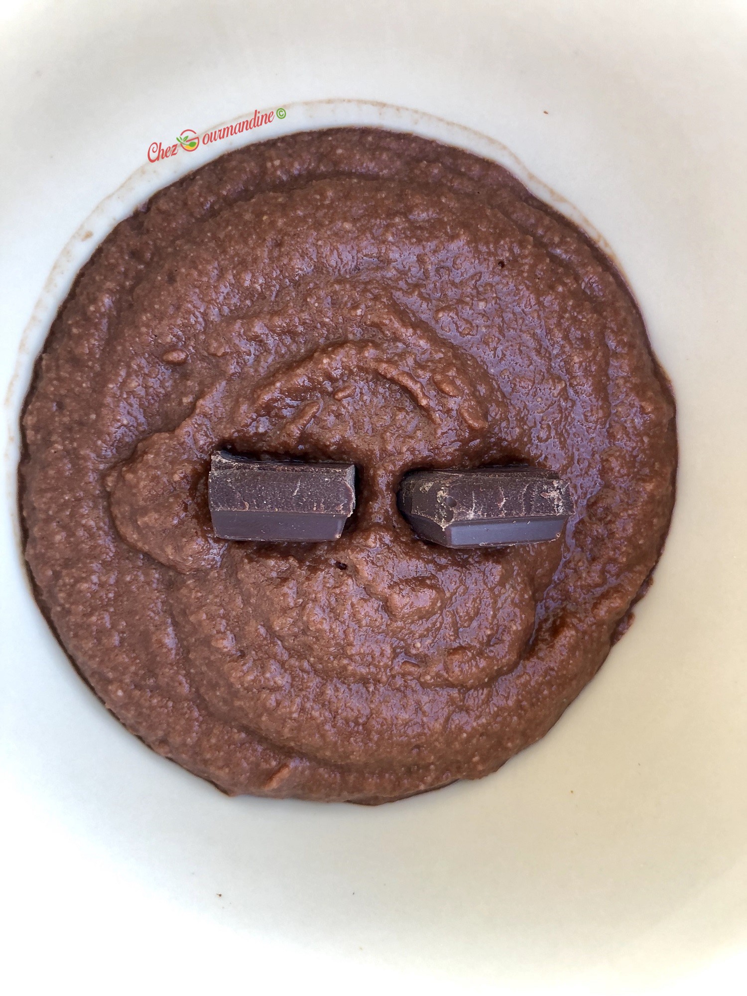 C’est une déclinaison du mugcake chocolat, avec de la farine de coco, et des bons carrés de chocolat noir qui fondent au milieu !