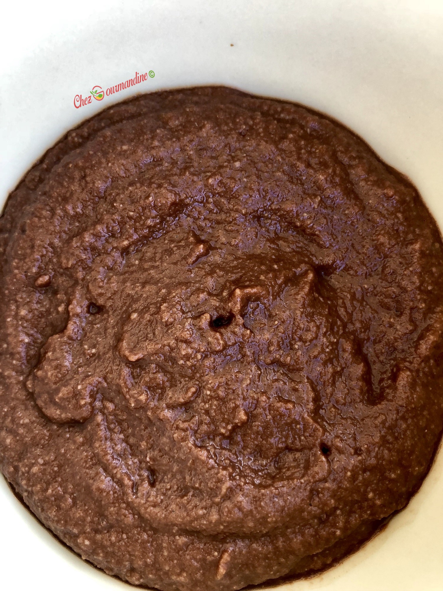 - Mélanger tous les ingrédients ensemble dans le bol ou la grande tasse qui va servir à la cuisson, sauf les 2 carrés de chocolat.