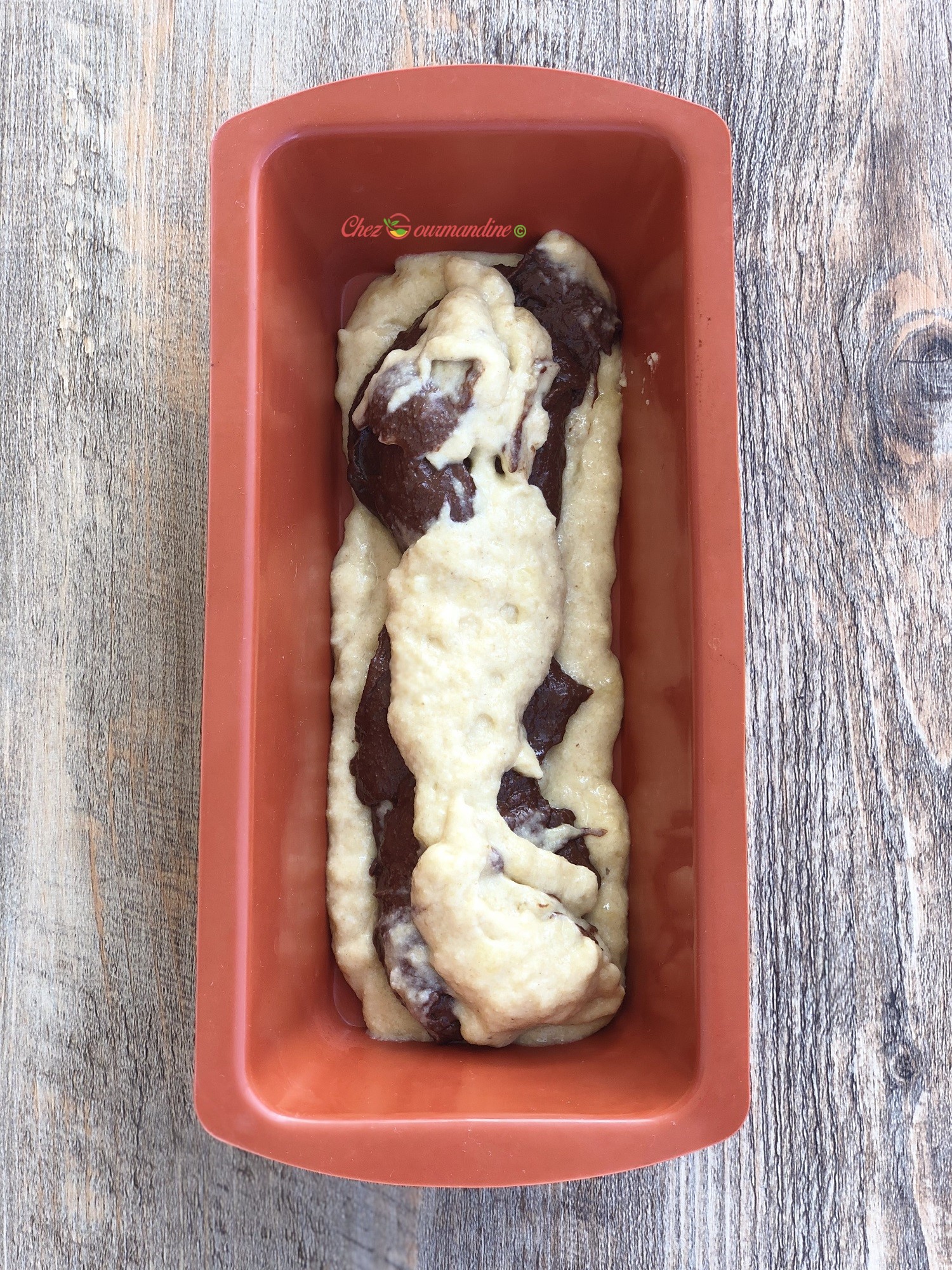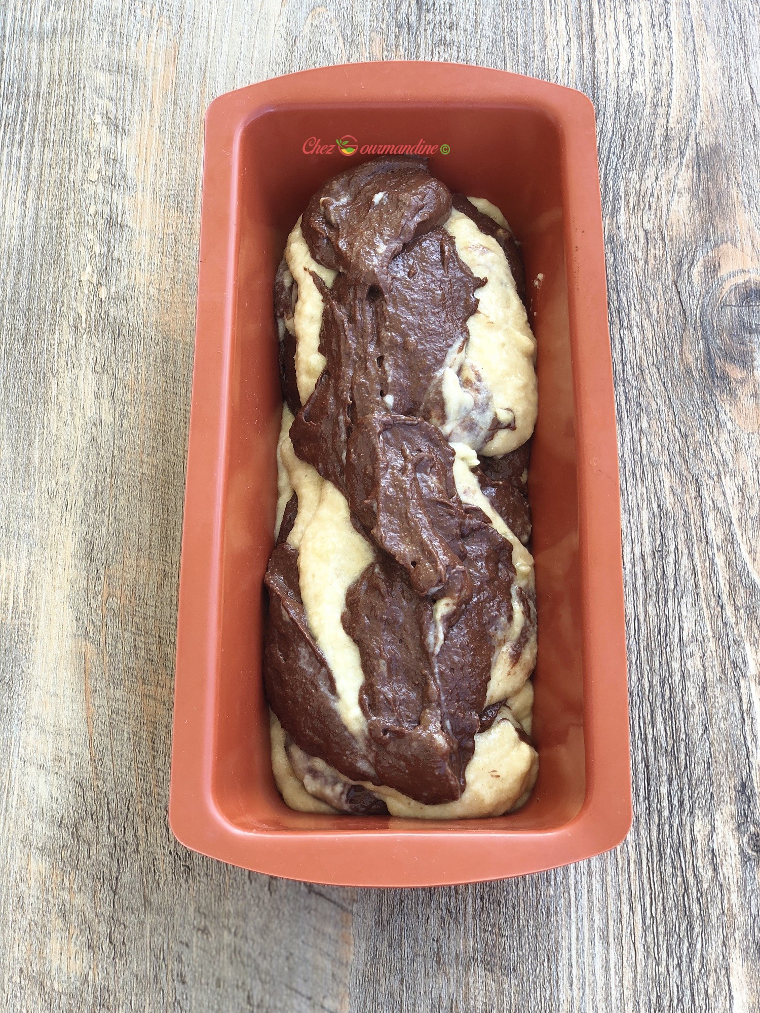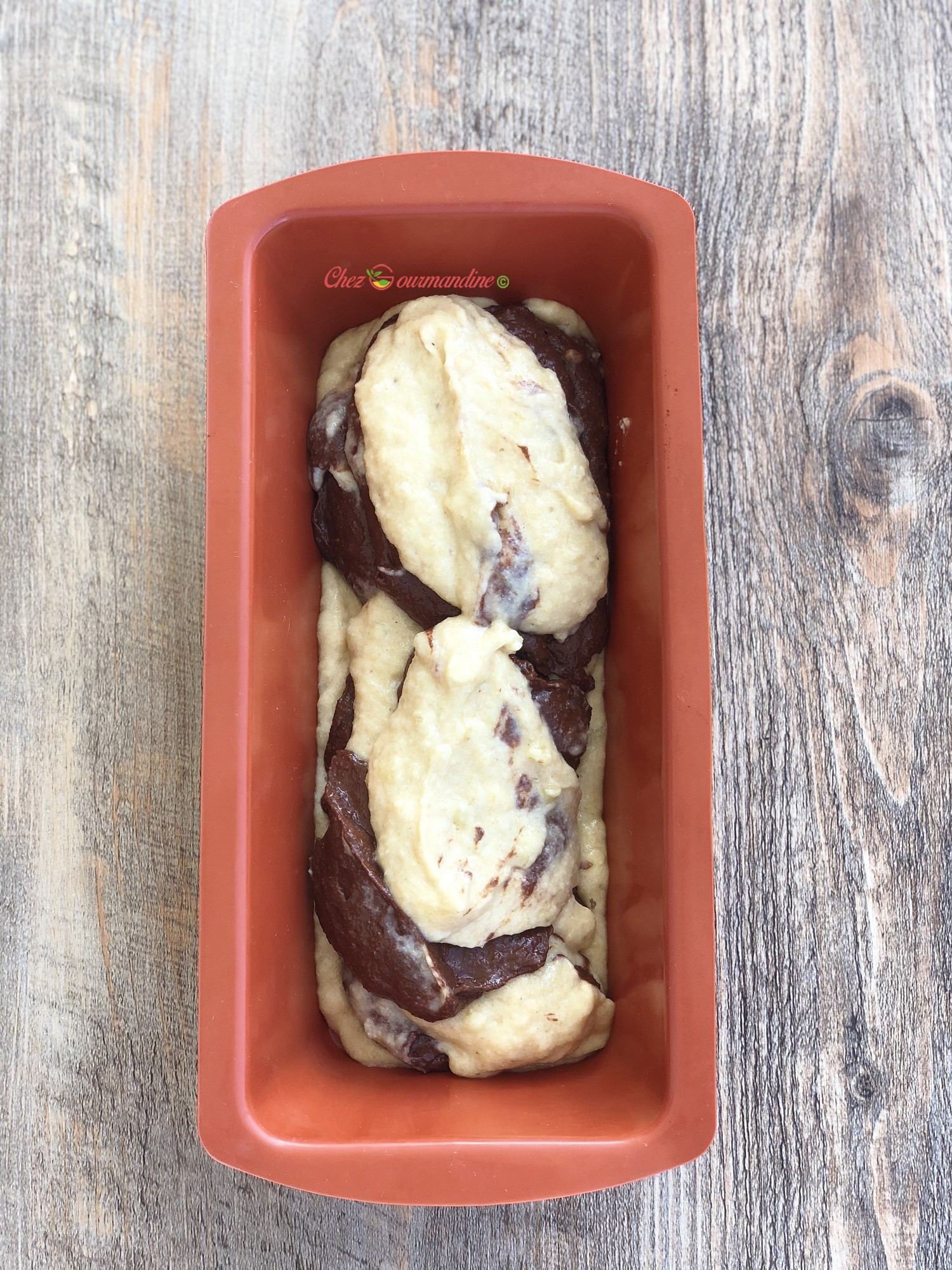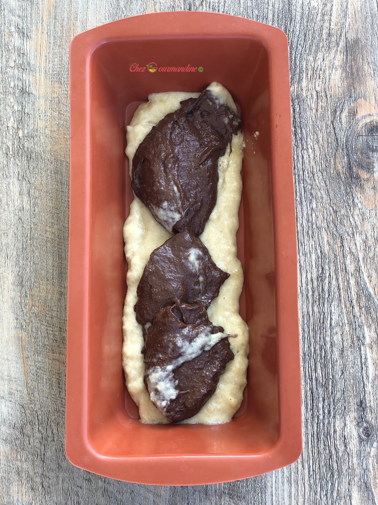 - Dans un moule à cake en silicone (le mien fait 22cms * 10cms), mettre une couche de préparation coco, puis une couche de préparation chocolat, puis à nouveau une couche coco et une couche chocolat jusqu’à épuisement.