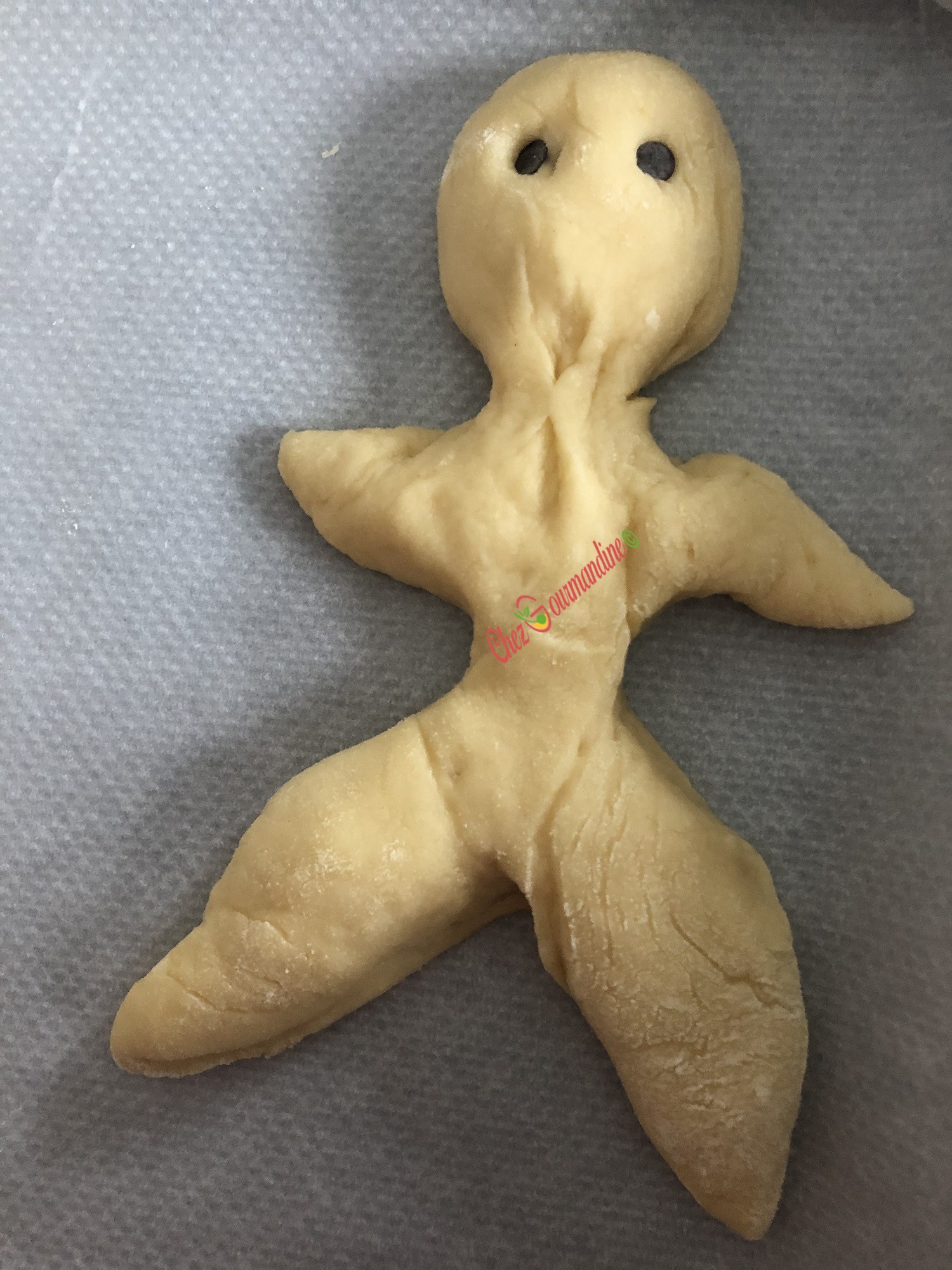 - Écarter légèrement les jambes et les bras, car la pâte va gonfler.