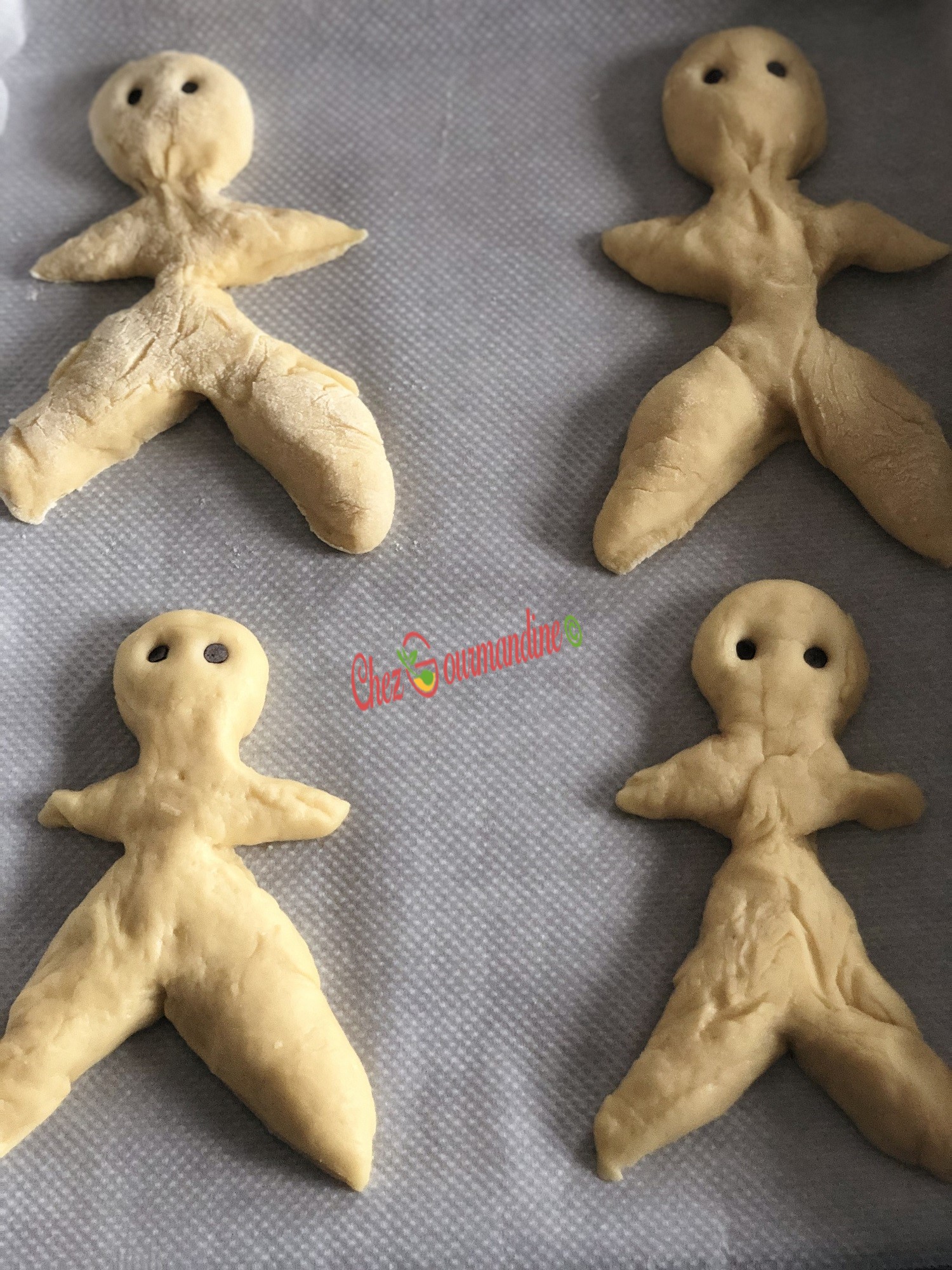 - Recouvrir la lèchefrite de papier sulfurisé ou d’un tapis en silicone, et déposer les bonhommes dessus, bien espacés pour ne pas qu’ils se collent à la cuisson.