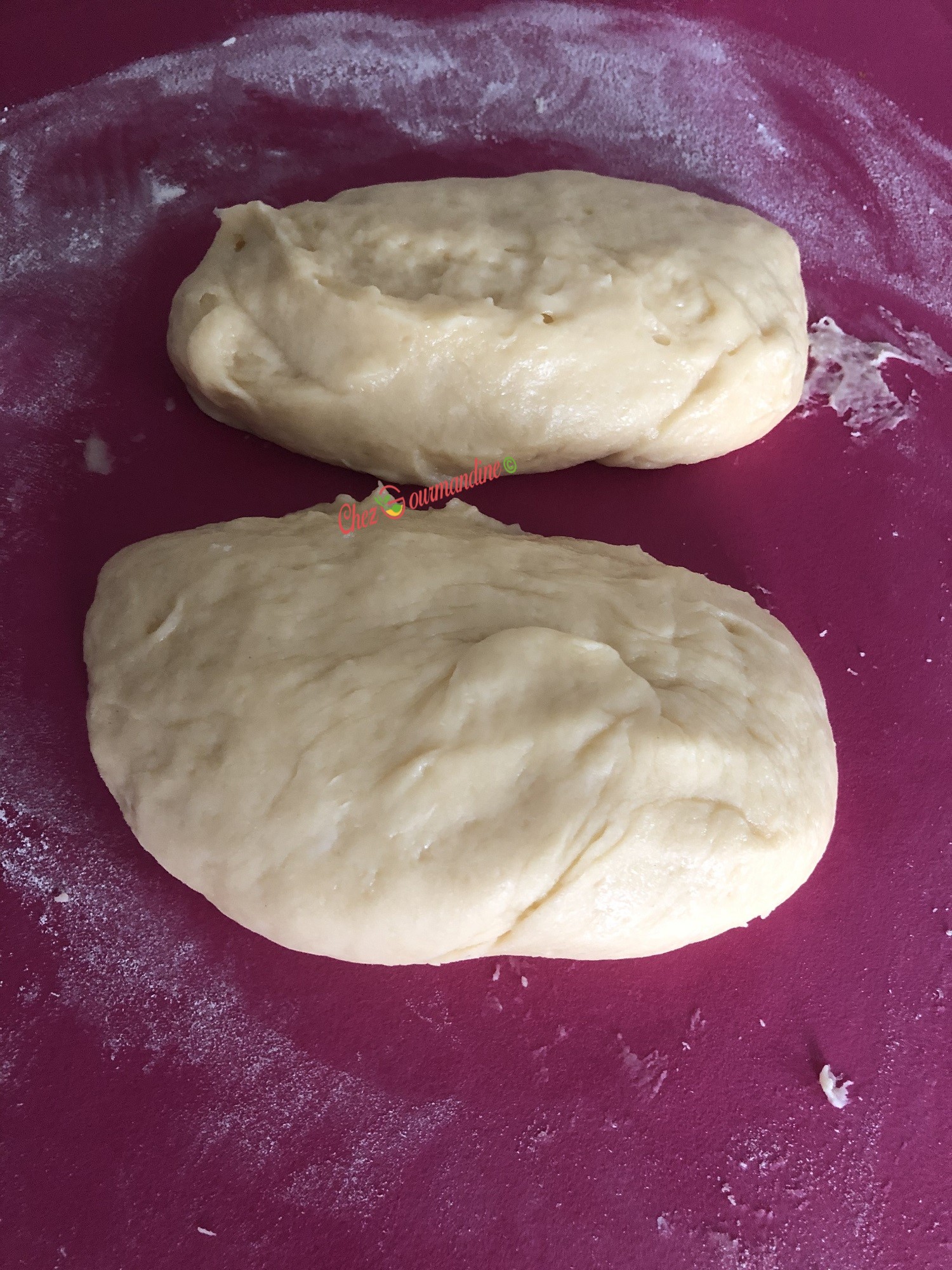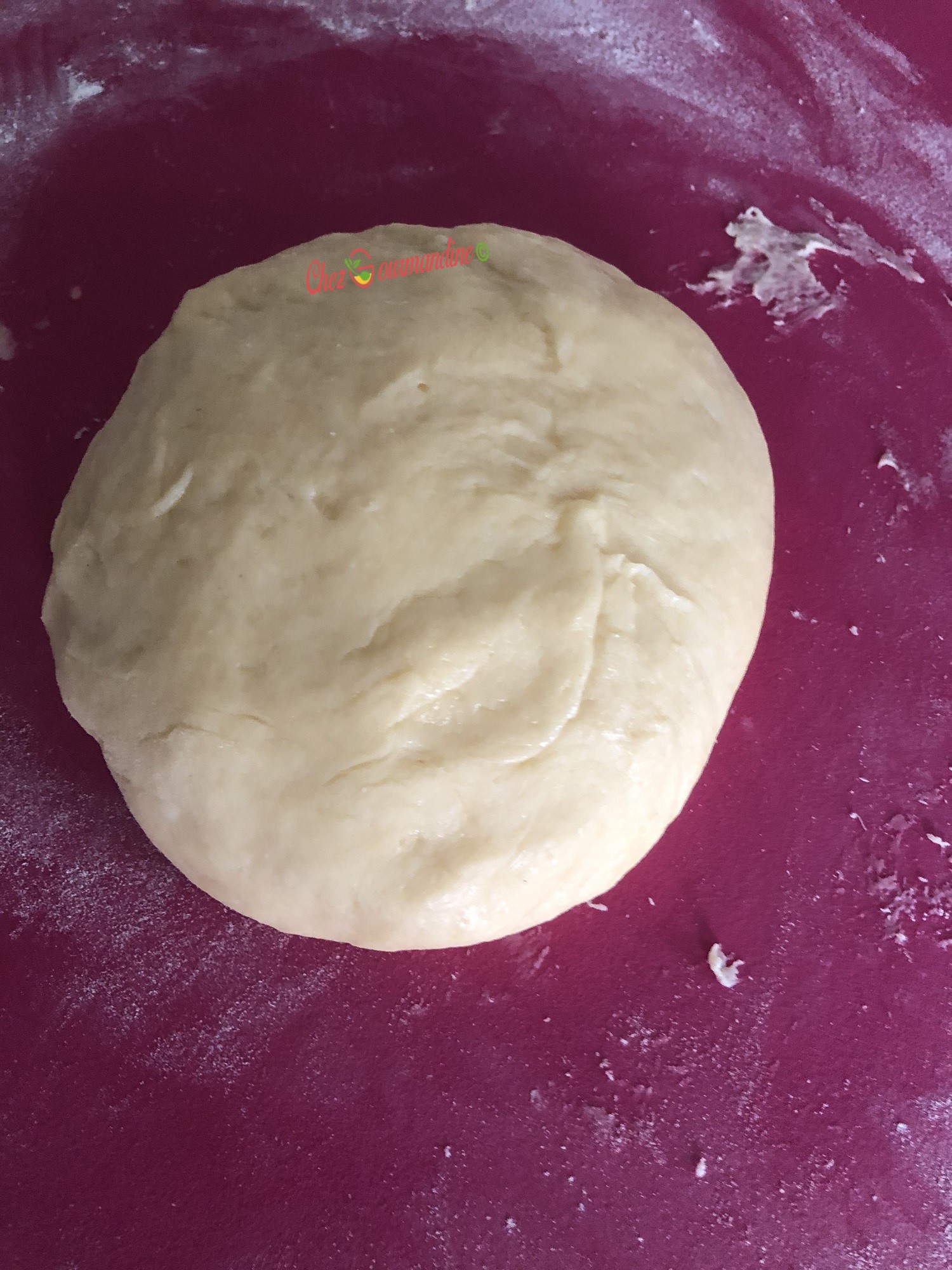 - Au bout d’1h30, sortir la pâte du bol en le retournant sur une planche à découper farinée, ou sur le plan de travail fariné, ou sur un tapis en silicone fariné.