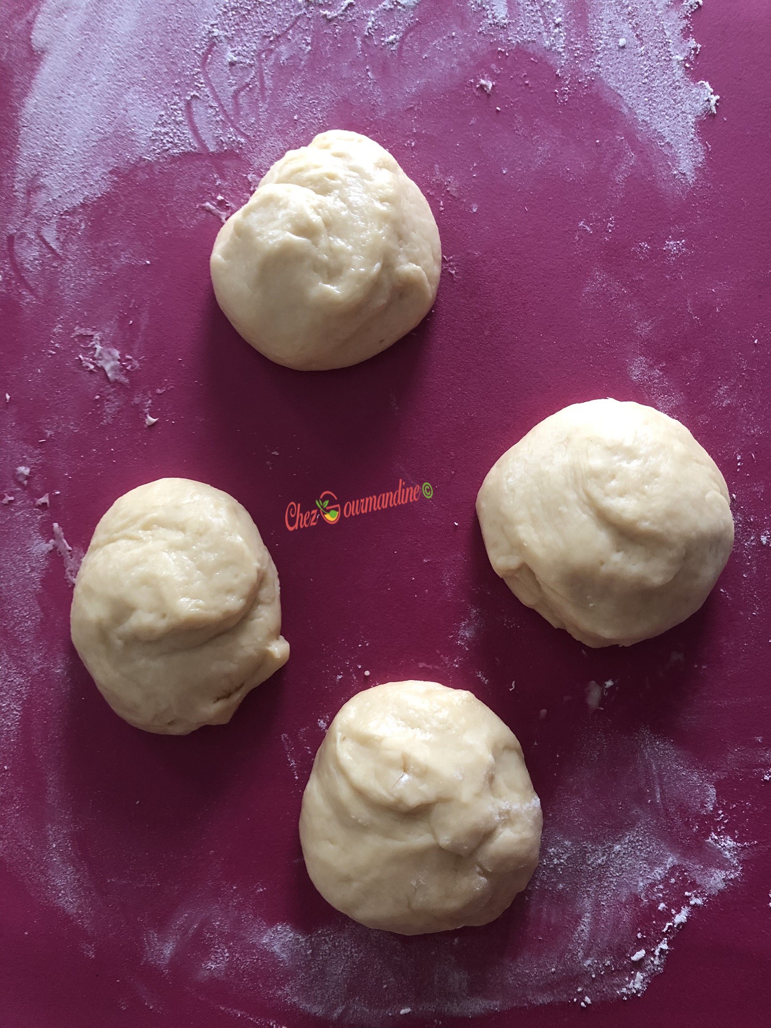 - Découper cette boule en 2 (photo 2 ci-dessous), puis encore en 2, afin d’obtenir 4 boules (photo 3).