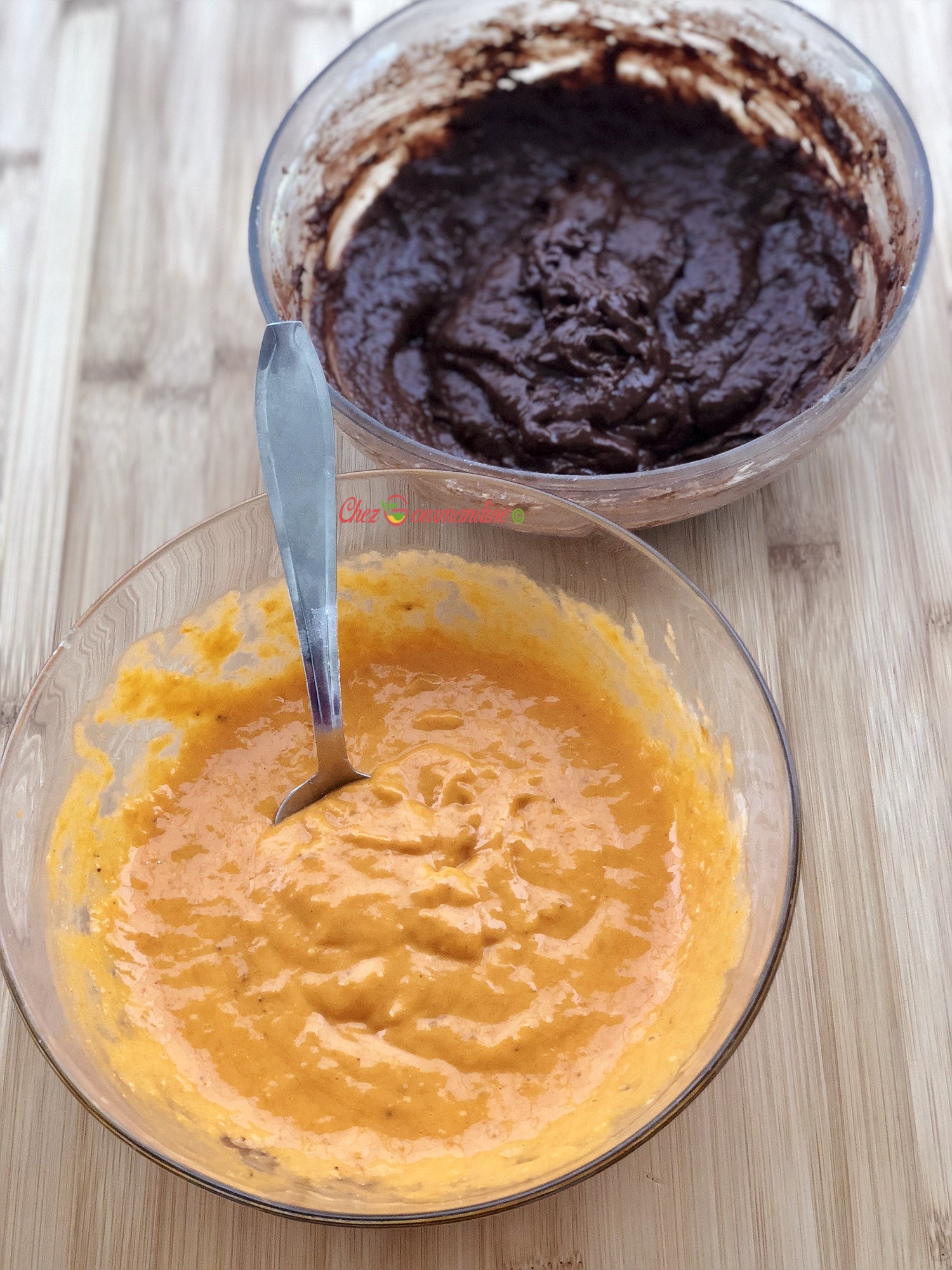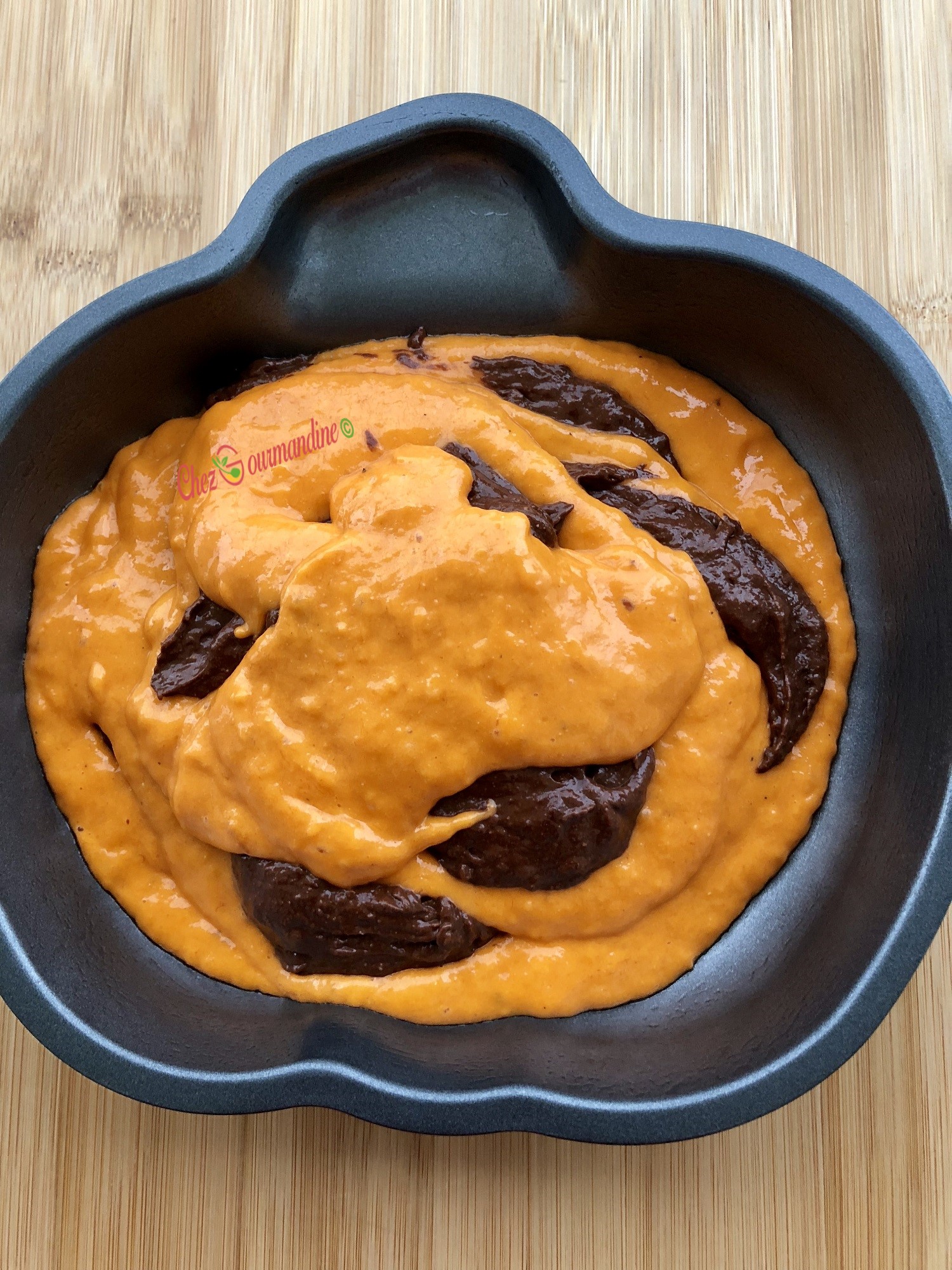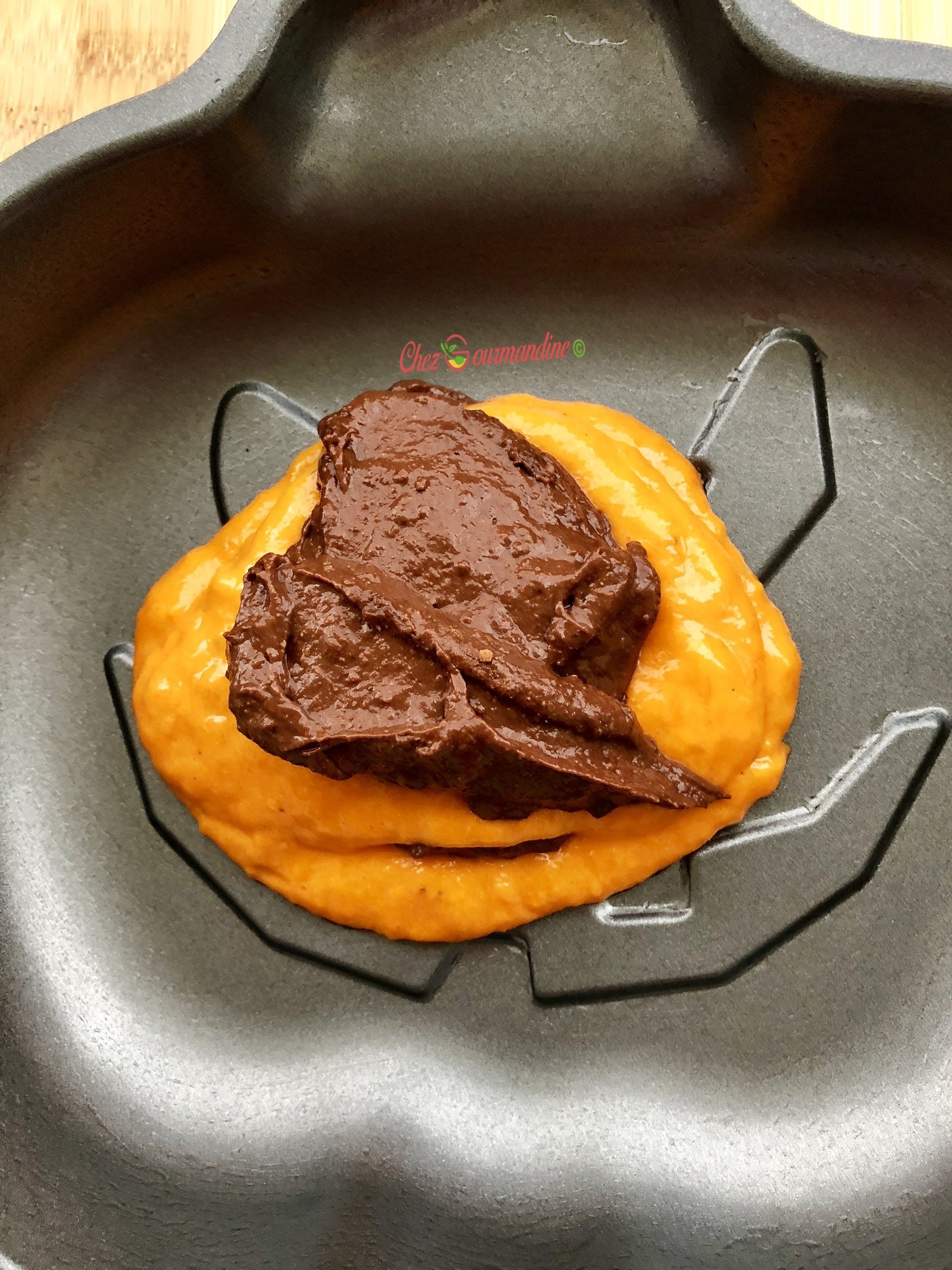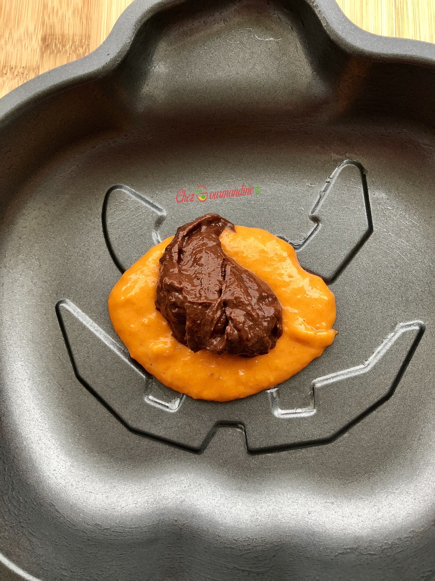 - Mettre une couche de préparation orange au centre du moule, puis une couche de préparation chocolat dessus, puis à nouveau une couche orange, et une couche de chocolat jusqu’à épuisement.