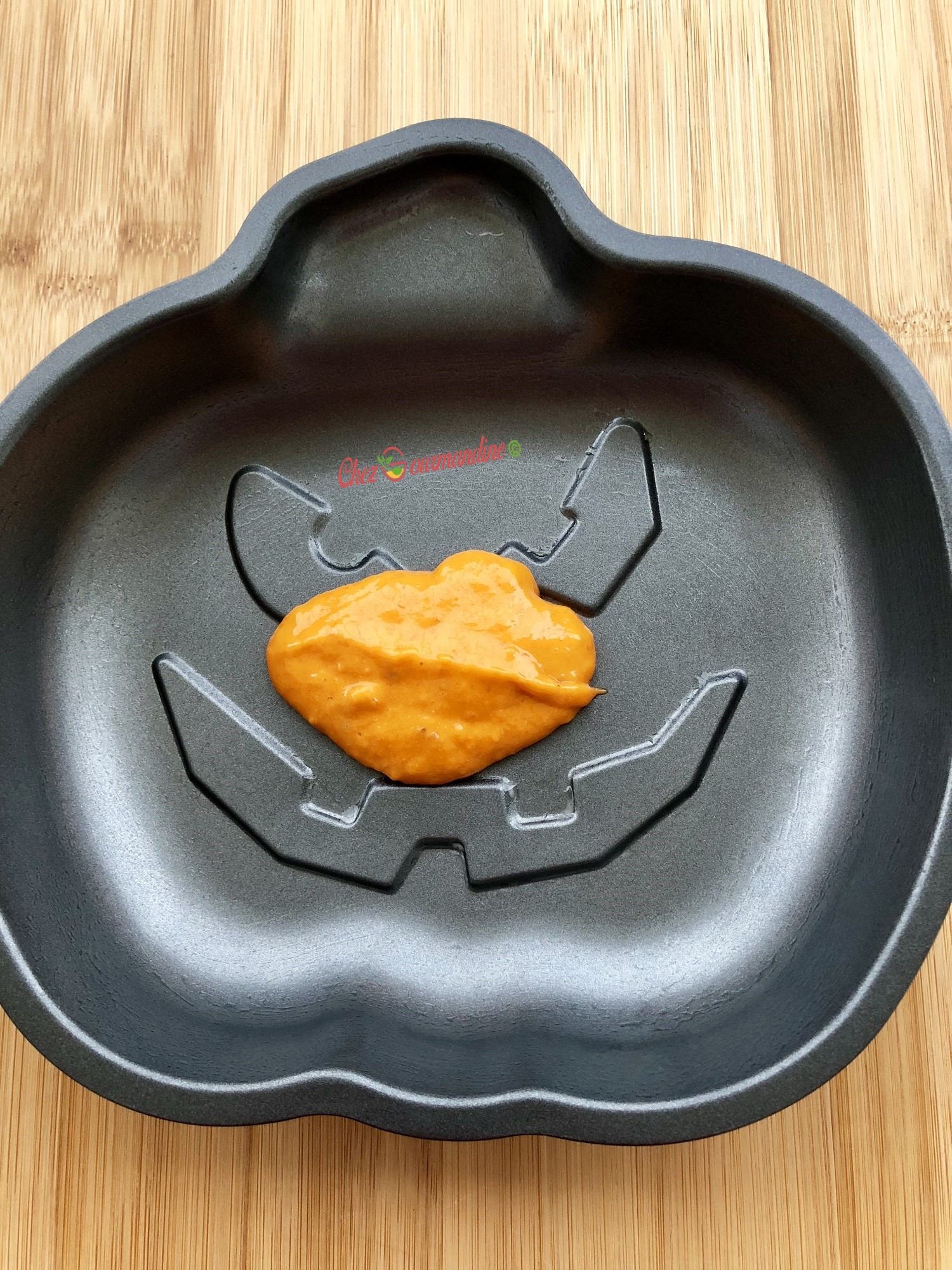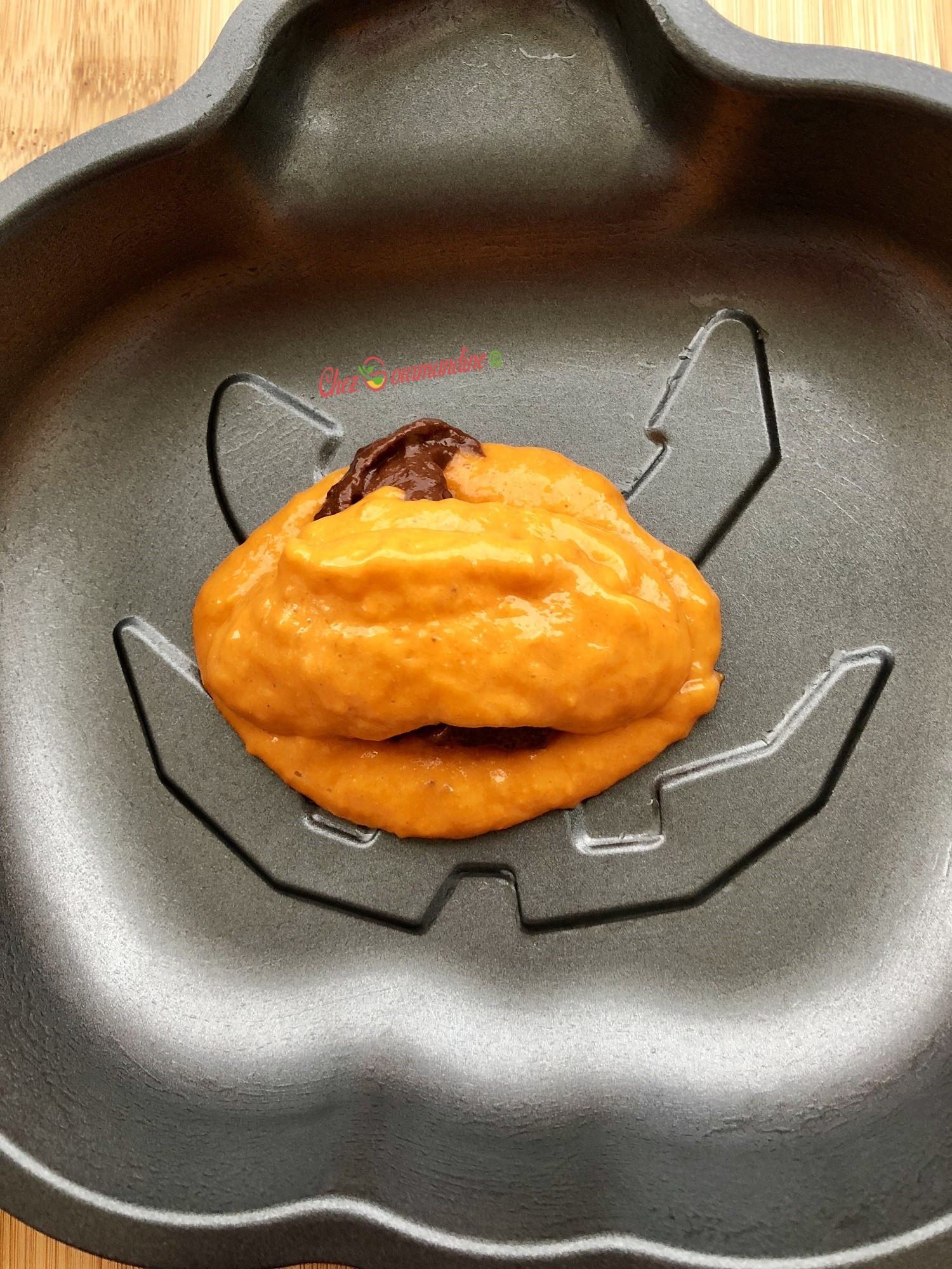 J’en ai profité pour le faire dans un moule citrouille pour Halloween, et j’ai rajouté du colorant orange dans la pâte pour l’occasion. Mais évidemment, je le referai sans le colorant, tout au long de l’année.